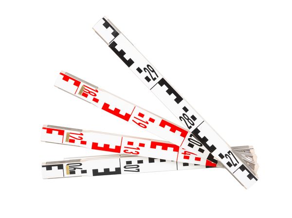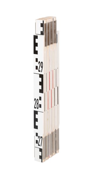 Geometer-Maßstab, Holz, starke Federn, Vorderseite: E-Teilung, abwechselnd je Meter rot und schwarz, Rückseite: weiß mit mm-Teilung, 10 Glieder, Schenkellänge: 38cm, Länge: 3m