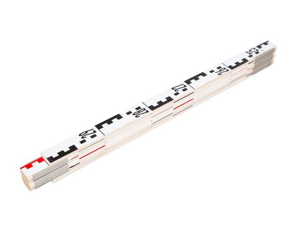 Geometer-Maßstab, Holz, starke Federn, Vorderseite: E-Teilung, abwechselnd je Meter rot und schwarz, Rückseite: weiß mit mm-Teilung, 6 Glieder, Schenkellänge: 54cm, Länge: 3m