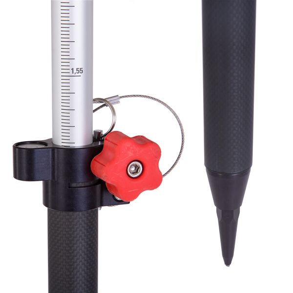 Karbon-Aluminium, Spitze mit Hartmetalleinsatz, wM 14cm, neutral, Klemmung: Schraubklemmung, Teilung: unverwüstliche Lasergravur, Außenrohr: Karbon, Außenrohrdurchmesser: 32mm, Innenrohr: stoßgedämft, Innenrohrdurchmesser: 25mm, 5 Arretierungen mittels Stift (1,60m, 1,80m, 2,00m, 2,20m und 2,40m), Anschluss: weiblich M12 mit Adapter, Arbeitsbereich: 150-260cm, Transportmaß: 135cm, Gewicht: 900g, inklusive Adapter